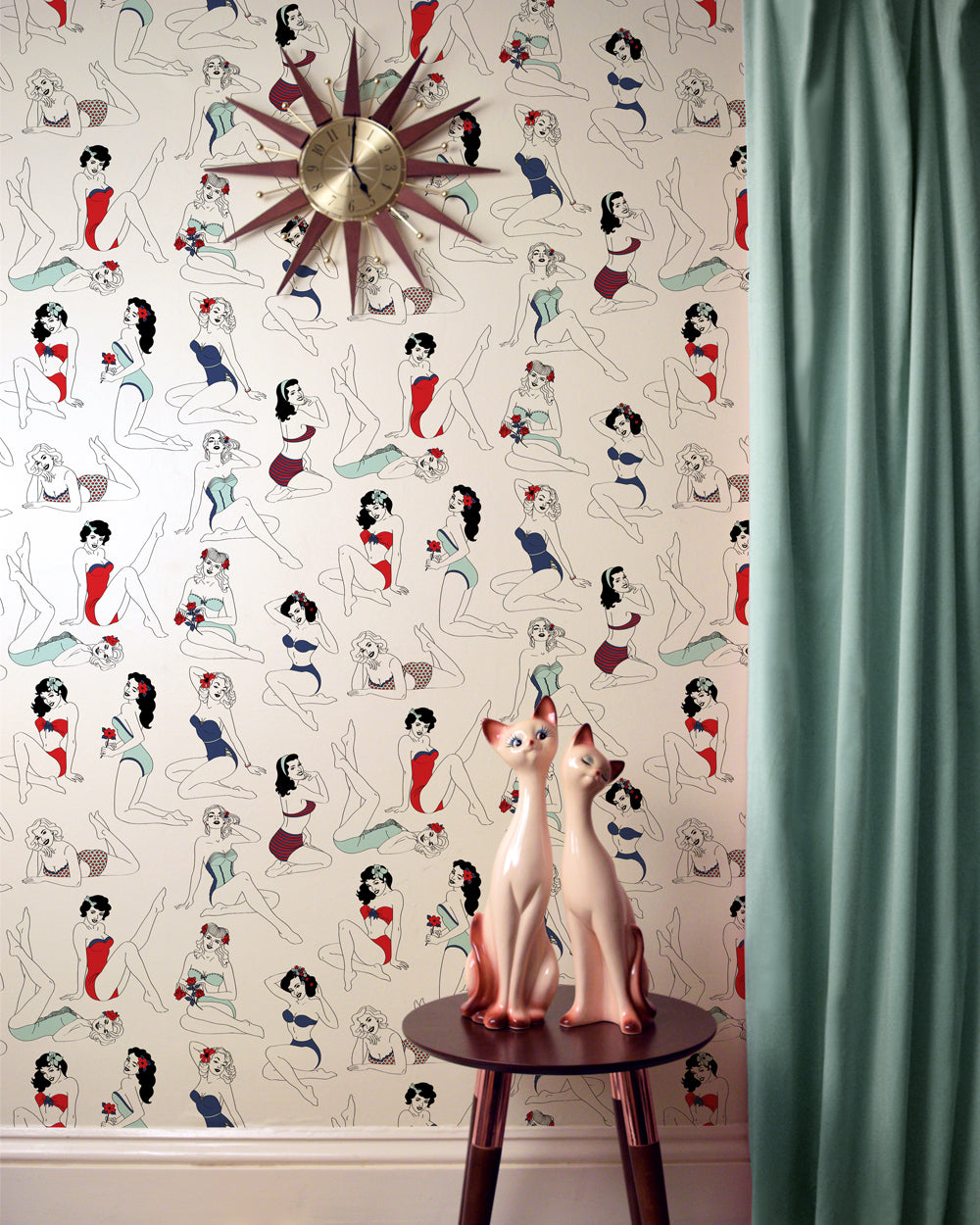 This boutique Pin-Up wallpaper by Dupenny is a nod and a wink to the great American pin-up artists and models of the past. If you’re a fan of the works of Gil Elvgren, Alberto Vargas and George Petty then this wallcovering is for you! Allow these buxom bombshells to brighten up the bedroom, boudoir and beyond.