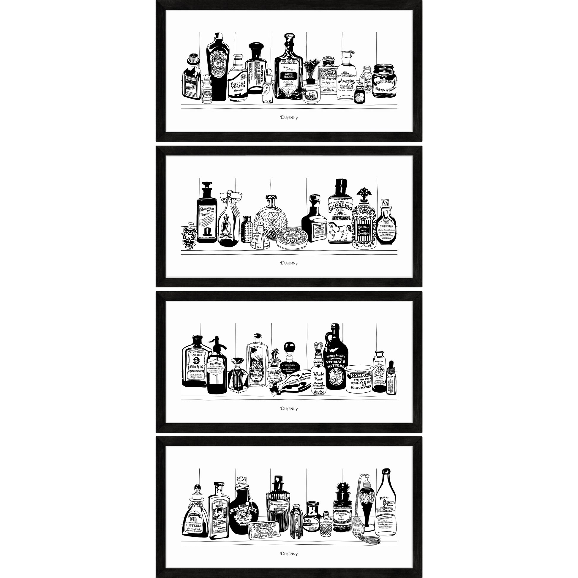 Add a shelf from a Victorian apothecary to your wall with these Potions art prints by Dupenny. Be sure to check the ingredients carefully, you never know what might be inside the bottles. Our art prints also make thoughtful gifts. Choose your favourite medicines or collect the entire cabinet for a 10% discount!