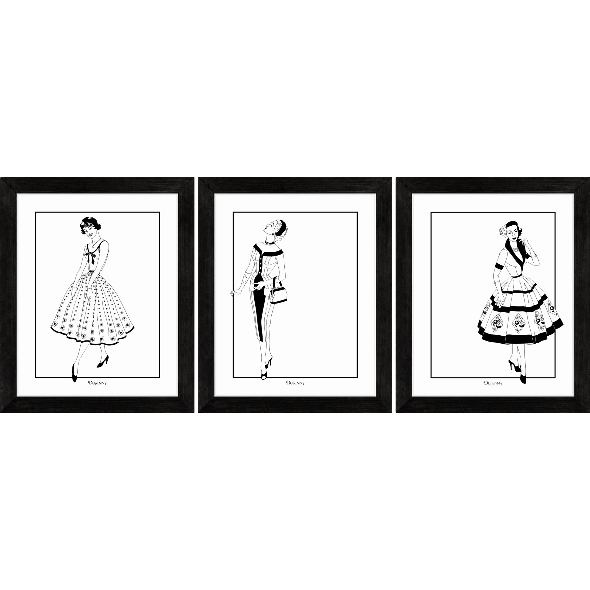 Midcentury fashion and vintage dresses are the inspiration behind this Vintage Dress wallpaper from Dupenny. Influenced by sewing patterns from the 1950s these chic art prints are the epitome of retro style. Strike a pose! Our art prints also make ideal gifts. Purchase the full set of 3 for a 10% discount!